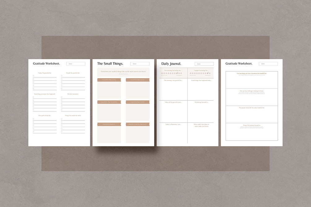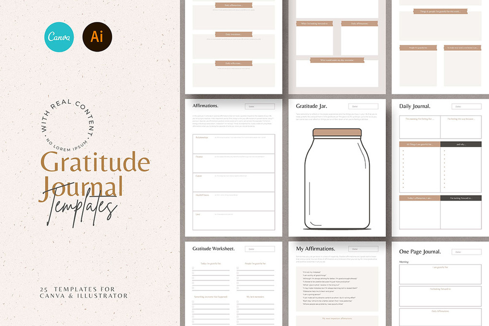 Introducing a bundle of Gratitude Journal Templates that can be used digitally or for printing. These templates are aimed at everyone who's looking to improve their life through journaling or is in the self help niche and wants better results for their clients. These templates are also perfect lead magnets to grow your email! The package includes a total of 25 easily editable templates - editable in both Illustrator and Canva.:)