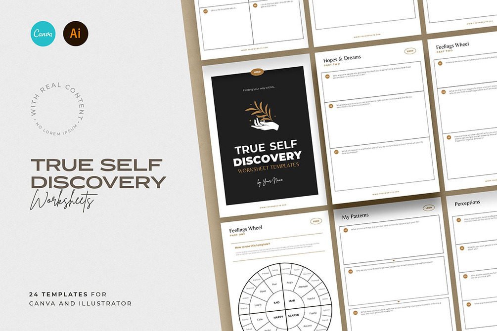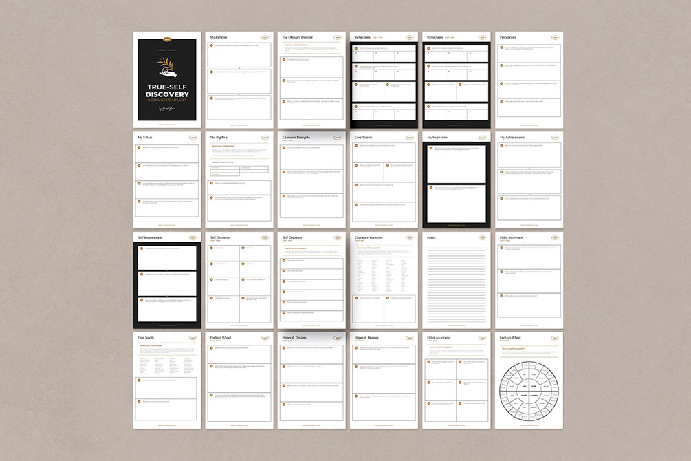 Introducing 24 True Self Discovery Worksheets for coaches, mentors and entrepreneurs. These templates are designed to help you or your client reach a better understanding of one's own psychology, patterns, emotions, talents and more. The templates will help you unlock your inner potential and get more clarity of what's holding you back and steps you should take.